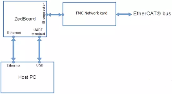 主站硬件主要由三部分组成见图4:PC端、Zedboard主站开发板以及外扩的FMC网卡。PC通过串口终端来实现操作系统指令输入,PC端上的EtherCAT网络诊断配置工具KPA EtherCAT Studio通过RPC服务连接Zedboard主站板,可以实现对主站和从站的配置,扫描生成网络配置文件。Zedboard作为EtherCAT主站板具体可参考 Avnet: Quality Electronic Components & Services 。