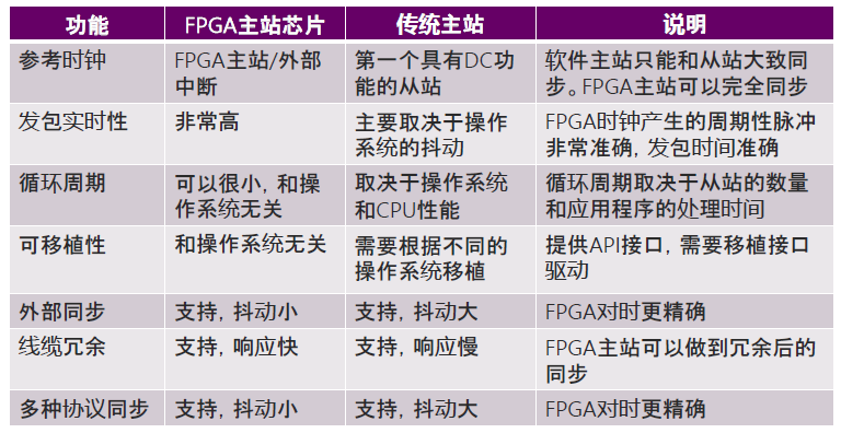 - 同步性能好,主站和各个从站设备可以达到远小于1us的时钟同步精度(4轴实测50ns)