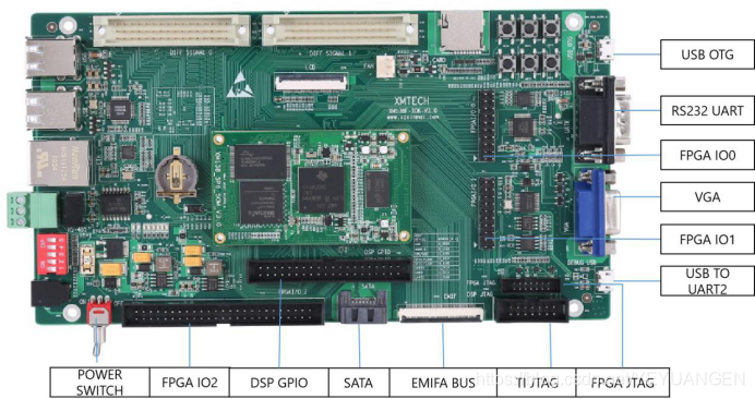 开发板引出丰富的外设,包含千兆网口、SATA、EMIFA、uPP、USB 2.0 等高速数据传输接口,同时也引出 GPIO、I2C、RS232、PWM、McBSP 等常见接口;