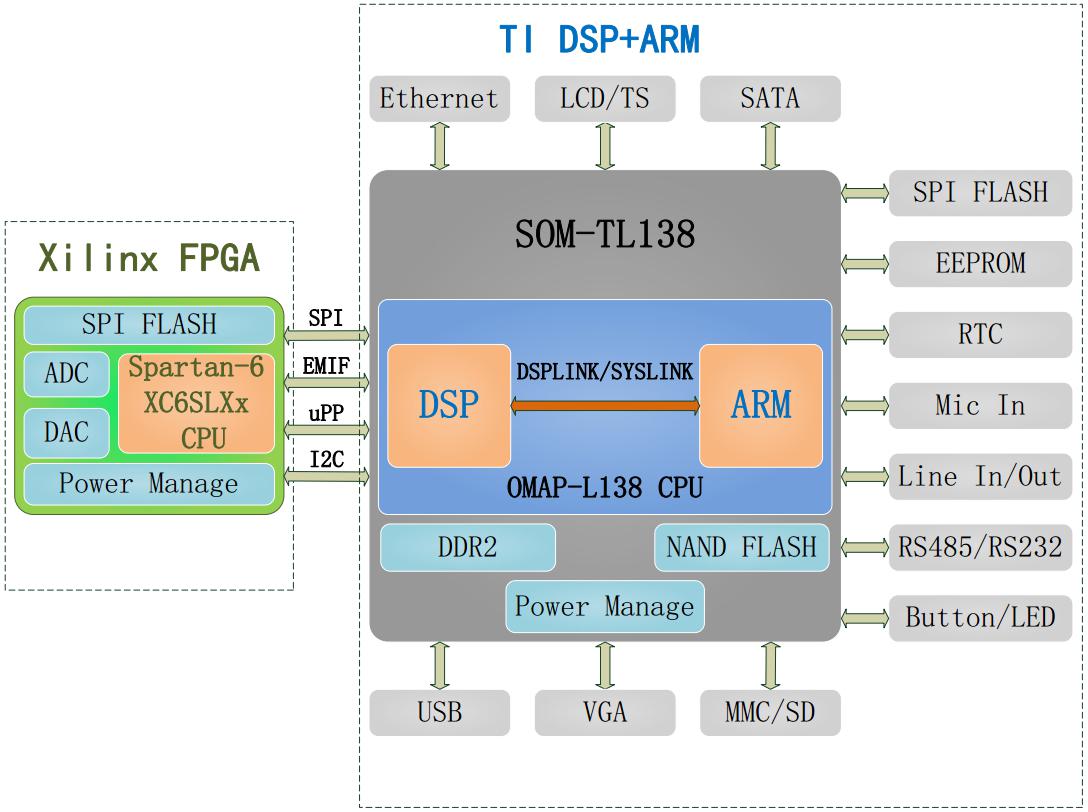 基于TI OMAP-L138(定点/浮点 DSP C674x+ARM9)+ Xilinx Spartan-6 FPGA处理器;