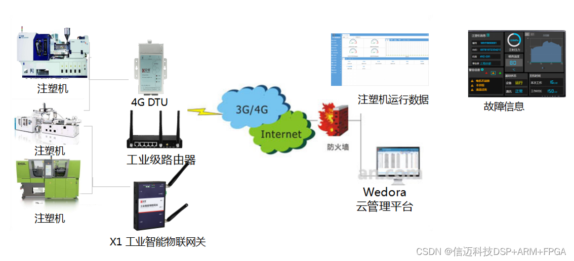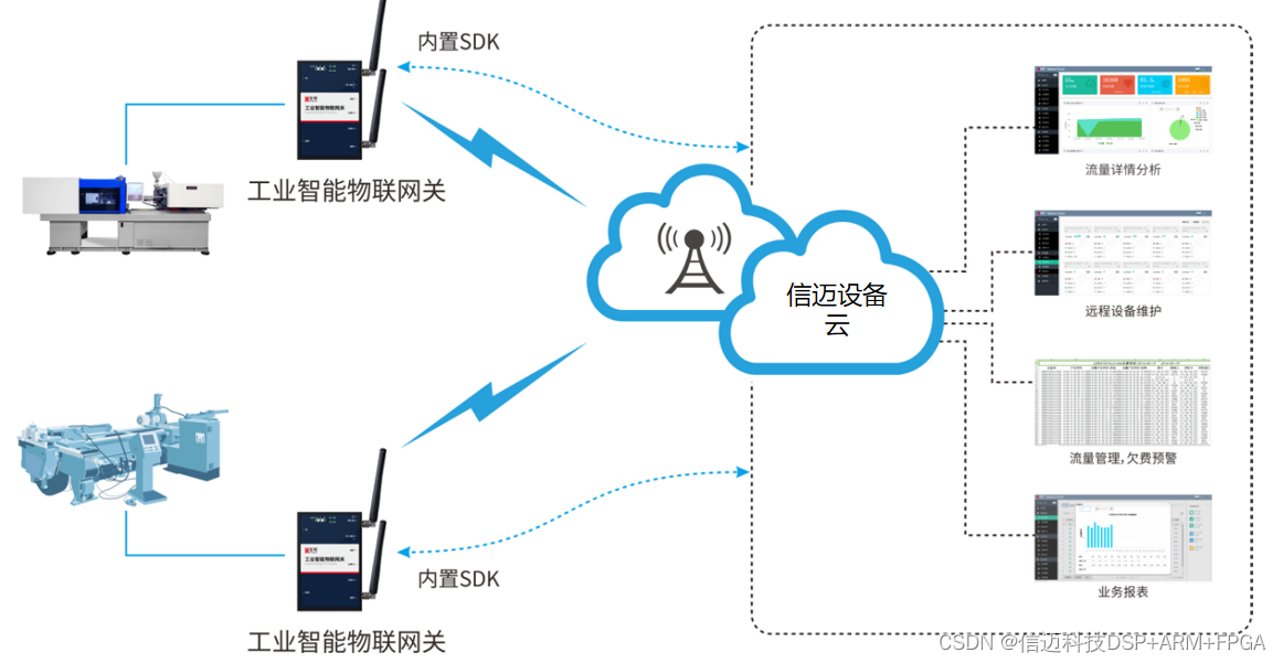 信迈深入了解数控机床设备厂商需求,为其提供数控机床数据采集与边缘计算方案,系统采用信迈工业智能物联网关,实现设备厂商技术服务中心与各地的机床设备无线组网,通过X1提供的4G稳定传输通道,实时将机床运行加工状态等数据传输到技术服务后台,管理远程的现场设备及数据,实时提示基础设备的管理情况,做到对机器实时感知,给与误操作进行报警及给定期保养提醒。做到超前服务,减少问题出现,方便维修维护。