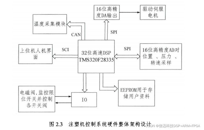 注 塑 机 控 制 器 是 基 于 T I 公 司 的 T M S 3 2 0 F 2 8 3 3 5 芯 片 的 控 制 系 统 , 是 整 个 注 塑 机 泵 控 伺 服 系 统 的 核 心 部 分 。 控 制 系 统 可 以 通 过 采 集 相 应 的 传 感 器 信 号 对 各 部 分 的 压 力 、 位 置 、 温 度 、 流 量 等 状 态 信 息 进 行 实 时 监 测 , 再 通 过 执 行 设 计 的 控 制 算 法 对 信 号 处 理 后 完 成 注 塑 机 工 艺 要 求 的 动 作 。