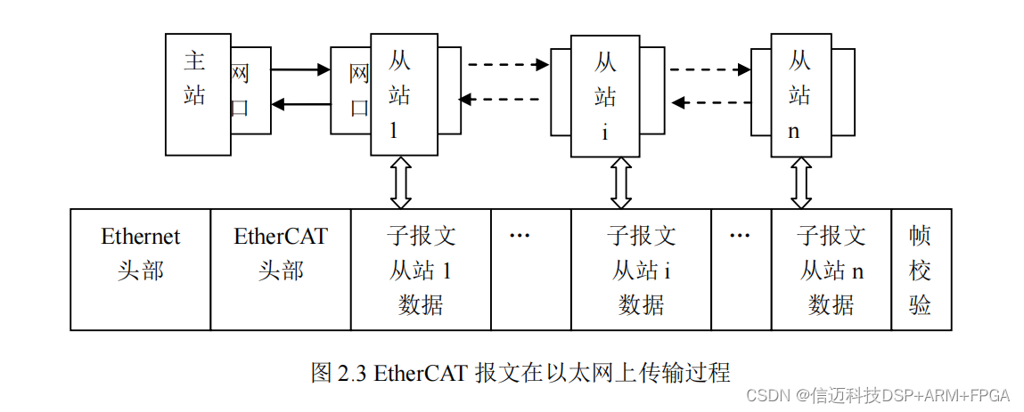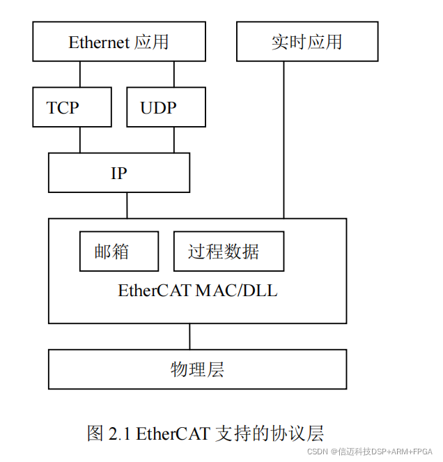 EtherCAT 是一个以以太网为基础的开放架构的现场总线系统,EtherCAT 数据部分封装在以太网帧中,主站发送以太网帧在以太网上传输。 EtherCAT 只需要物理层,数据链路层和应用层,OSI 七层协议体系结构中 的另外四层都不是必需的。EtherCAT 帧结构也可以封装在 IP/UDP 数据报中,进而上传到从站的应用层由从站控制器的硬件进行处理[16]。如图 2.1 所示。