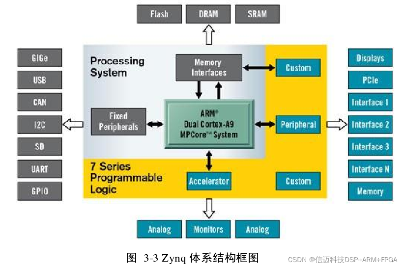 或单纯的 FPGA 方案。它包含了完整的 ARM 处理子系统,并以该子系统为 ZYNQ 的