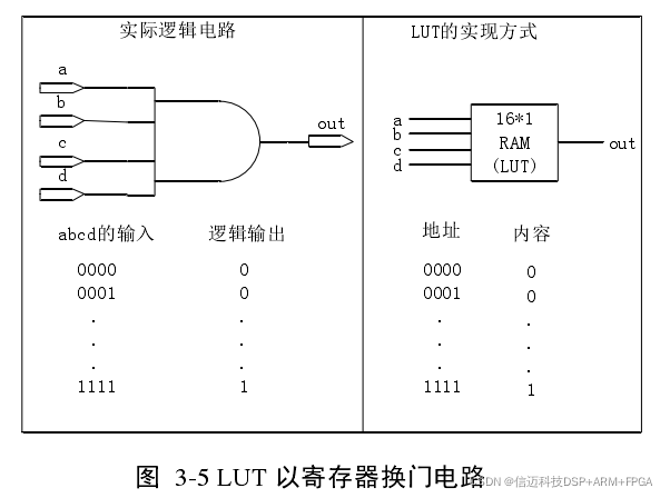 LUT 是 FPGA 中可编程逻辑的最小单元。图 3-5 所示是 LUT 以存储器换门电路的