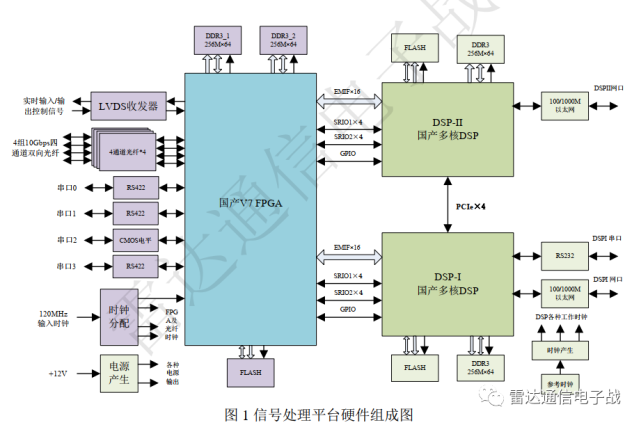 信迈科技信号处理平台的组成框图如图1所示,由四组4通道双向光纤接口、FPGA 及其扩展电路(2组独立读写的 DDR3 存储器、FPGA扩展的4个串口、实时控制信号输入/输出等),两片FT-M6678 DSP及其扩展电路、DSP时钟电路、100M/1000M以太网、主DSP的RS232扩展、DSP间互连接口、DSP与 FPGA间的EMIF、SRIO接口,供电电源等部分组成。