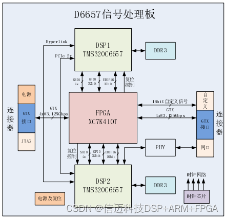 - 高速数据传输部分由 EMIF、I2C、PCIe、SRIO 等通信接口构成。大规模吞吐量的 AD和 DA 数据,可通过 SRIO 和 PCIe 接口在 DSP 和 FPGA 之间进行高速稳定传输;DSP 可通过 EMIF 总线对 FPGA 进行逻辑控制和进行中等规模吞吐量的数据交换,同时可通过 I2C对 FPGA 端进行初始化设置和参数配置。