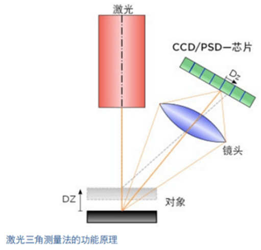 激光线或点出现在相机前的对象上,由2D相机记录。如果使相机跨过目标或在目标旁移动(例如通过传送带),被测量对象到芯片之间的距离会改变,那么激光线或点的观察角度随它们在相机图像中的位置一起变化。这样,通过数学运算,对象和光源之间的距离就可以通过图像中的位置坐标计算得出。