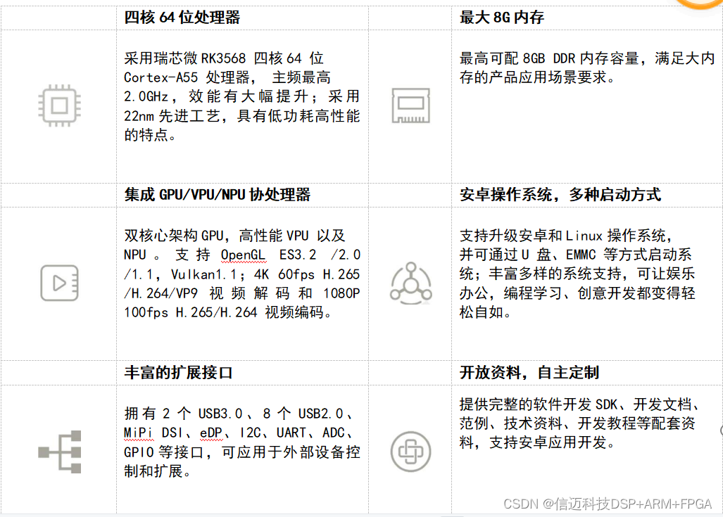 信迈XM3568A主板采用瑞芯微RK3568 四核64 位Cortex-A55 处理器, 主频最高2.0GHz,效能有大幅提升;采用22nm先进工艺,具有低功耗高性能的特点。