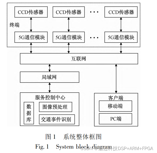 本系统是由电荷耦合器件图像传感器( charge coupled device,CCD) 、5G 无线通信模块、服务器和 客户端组成。 利用 CCD 采集交通视频信息,5G 通信模块将 采集到的视频信息传输到服务控制中心,在服务器 端先对视频图像进行预处理,对雾天图像和低照度 图像进行去雾和提升亮度的操作,提高对比度和清 晰度并进行存储。接着采用交通事件识别算法对 交通事件进行识别,最后将识别的信息发送到客户 端进行预警。系统整体结构如图 1 所示。
