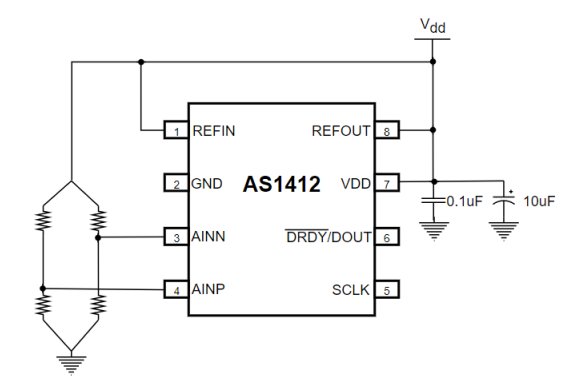 以下是AS1412用于称重测力的示意图,ADC可以直接采样传感器的差分输出信号,传感器激励与ADC基准采用相同的电压源以降低系统成本,也可以采用恒流驱动传感器以提高抗干扰性能。