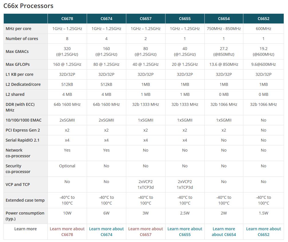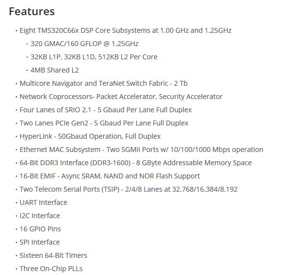 TMS320C6678具有8个TMS320C66x™ DSP Core ,每个核可以运行在1.0 GHz或 1.25 GHz或 1.4 GHz。