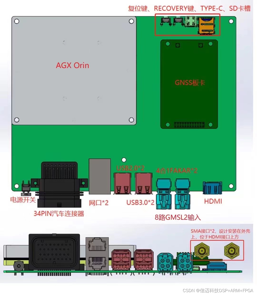 信迈科技的AGX Xavier GMSL 载板,是一款带有×GMSL视频输入接口的 嵌入式 人工智能计算产品,能够为众多终端设备赋予人工智能计算力,从而有效降低人工智能产品的落地门槛。Xavier能够提供高达32Tops计算能力,能够很好的满足低速无人驾驶,工业机器视觉等场景的图像、激 光 点云等计算需求。