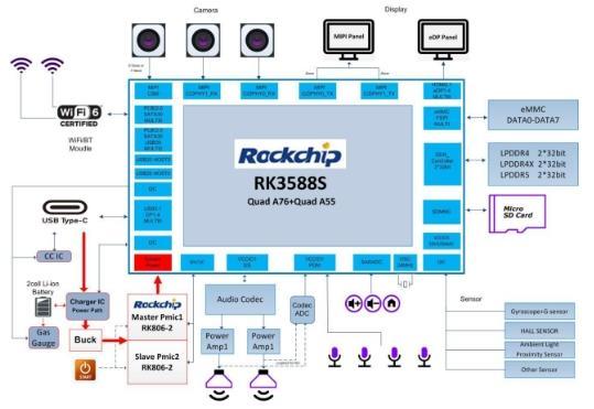 (2)RK3588 EVB搭载RK3588芯片,采用8nm制程工艺,四核ARM Corte A76+四核ARM Corte A55 CPU,内置6Tops 独立NPU,运用RK806-2双PMIC供电方案,支持LPDDR4X/eMMC存储,拥有HDMI、MIPI、VGA、SATA等10余个外设接口,具有集成度高、性能强、扩展能力强等特点,满足各类行业AIoT终端设备对产品的需求。