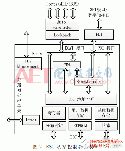 EtherCAT从站控制器主要包括数据帧处理单元、EBUS接口编码/解码模块、 Auto -forwarder模块、Loop-back funcTIon模块等。以ET1100/ET1200从站控制器为例,其内部框架如图2所示,主要包括MII、EBUS接口,EtherCAT数据帧处理单元,现场总线内存管理单元(FMMU,Fliedbus Memory Management Unit),存储同步管理通道(SM,SyncManager),分布时钟,PDI接口,ESC地址空间(包括寄存器和用户数据存储器),EEPROM控制,以及状态控制、中断、看门狗和物理层管理等部分。