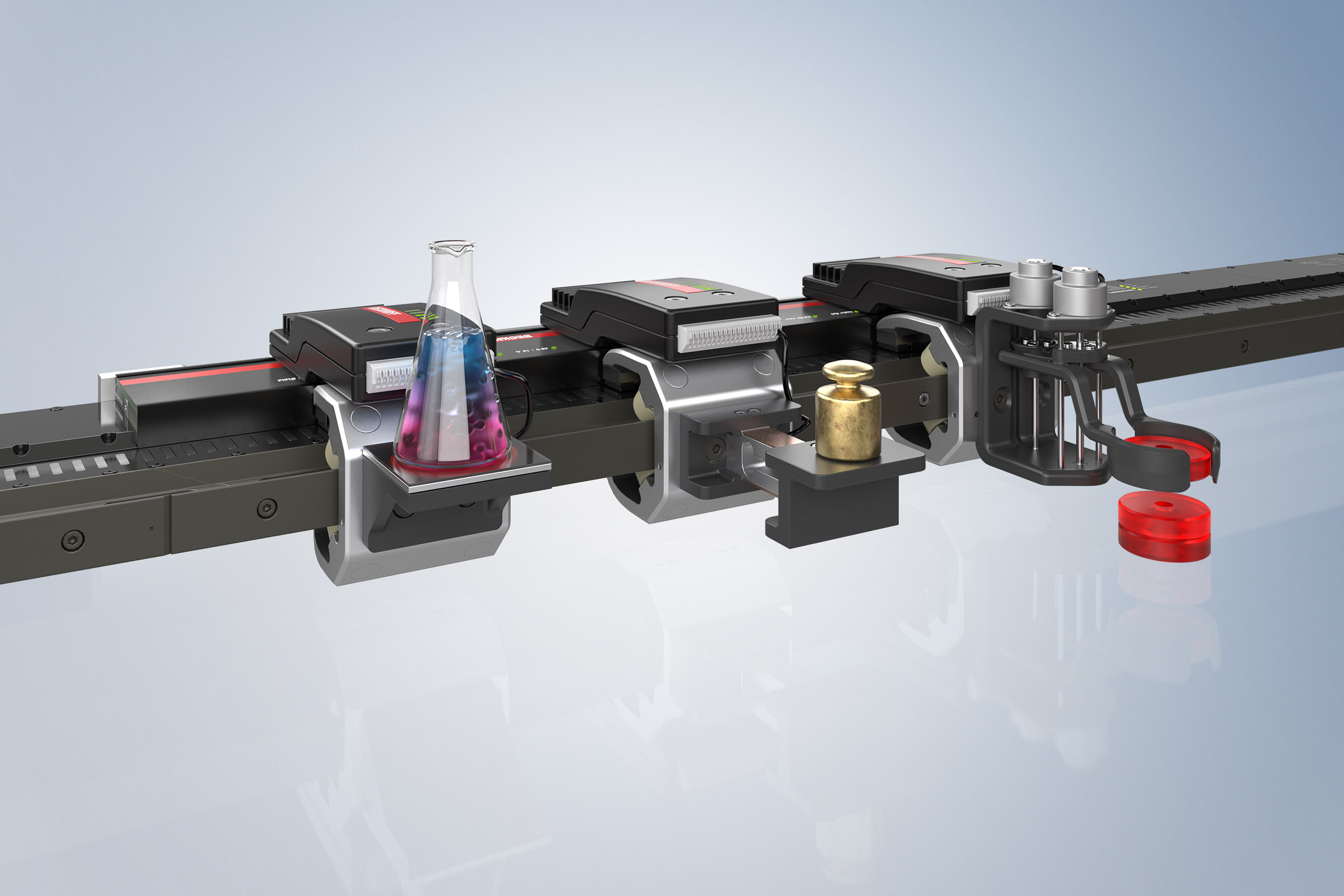 通过 NCT 能够在加工过程中对动子上的产品进行加工和质量检查。足够的功率以及与 TwinCAT 控制系统的高速通信能够轻松连接传感器和执行器。每个动子之间的数据通信都是实时进行的,再加上 EtherCAT 的使用,可以以微秒精度实现整个系统的同步。尤其是在产品搬运、加工和输送同时进行的测量以及快速变化的生产批量的设备改造方面,NCT 为用户提供了实现全新解决方案的可能。