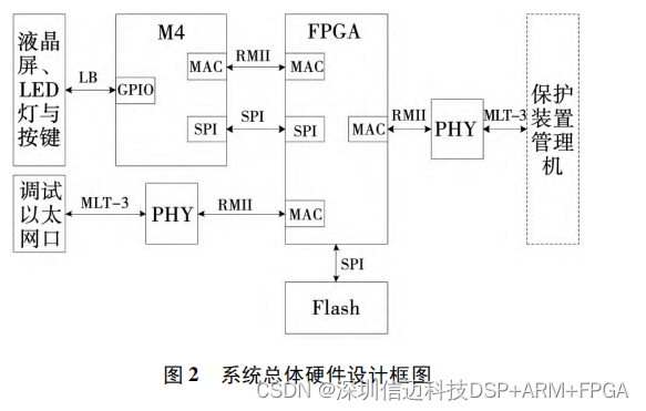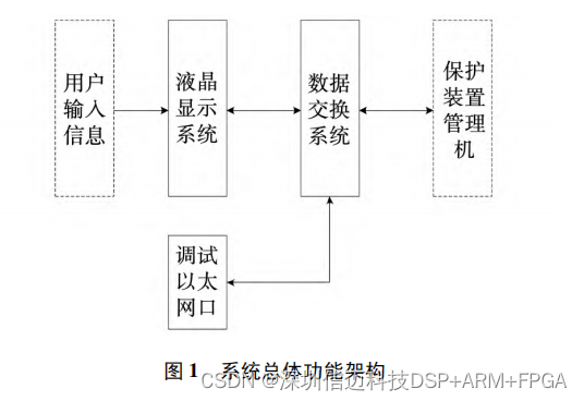 ②人机交互功能: ARM 处理器驱动液晶屏, 显示保护装置输出的信息,同时接收液晶屏和按 键输入的用户信息,发送给 FPGA。