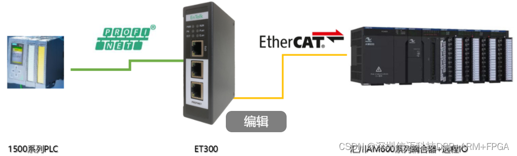 河南某现场控制器采用西门子1500系列PLC,远程IO站的模块均来自汇川AM600中型系列PLC;所有的IO模块均挂在AM600-RTU-ECAT的耦合器上;汇川的耦合器模块在正产工作时支持 EtherCAT协议 ,作为EtherCAT从站,监控系统西门子S7-1500系列PLC支持PROFINET协议。协议上不一致无法直接通讯实现数据交互。需要通过第三方的协议转换模块来实现不同协议之间的数据交换。在本案例中使用自研 EtherCAT Master to PROFINET Slave网关模块ET300,实现PLC和远程IO数据的整体交互。