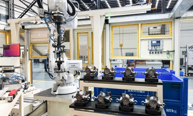 • 料筐就位,视觉识别卡钳位姿并区分正反,引导机器人抓取放置至对应工装台