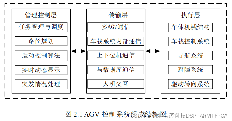 管理控制层主要指地面控制系统,由系统监控管理软件、上位 PC 机等组成,是整个 AGV 系统的大脑; 传输层一般是指地面控制系统与车载控制器之间的通信,但有时根据不同的系统需求,也会扩展通信对象,并设计专用的通讯系统,是系统间任务信息传输的坚固桥梁; 执行层是系统主要硬件组成部分,主要包括车辆主体、导引系统、车载控制系统、电源系统、驱动转向系统等。