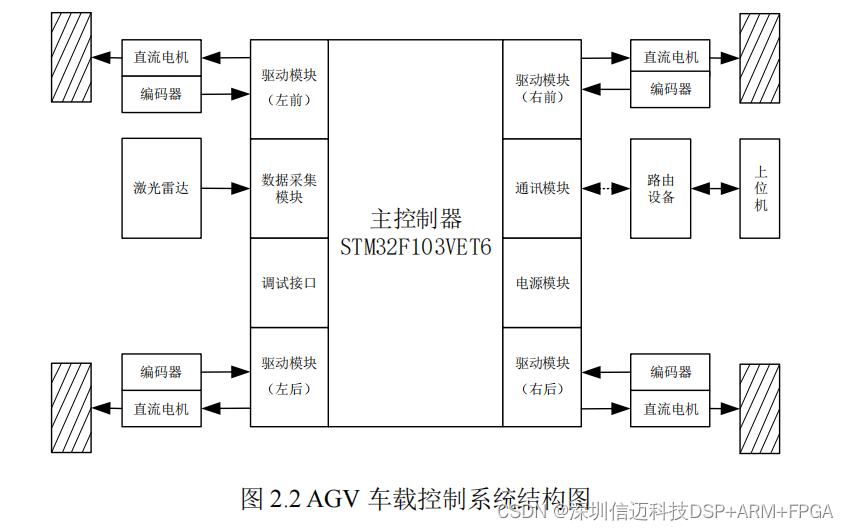 AGV车载控制系统主要包括车载主控器模块、激光雷达导航模块、直流电机驱动模块、电源模块、通信模块、安全避障模块、信号采集电路模块、声光报警模块等。其中,车载主控器模块是 AGV控制系统的核心,负责控制协调 AGV车体其它单元按指令工作,主要工作是完成信号的输入,处理和输出、实时控制、故障诊断和故障处理等,以满足 AGV 控制系统实时调度的要求。车载控制系统各硬件模块之间通过总线方式进行连接,常用连接方式有 CAN、SPI、IIC 等[31]。一般的 AGV 由 MCU(微处理器)作为控制芯片,考虑到工业现场环境复杂,对控制芯片以及系统干扰很大,本次课题研究将 STM32F103VET6 作为 AGV 的控制核心,具有稳定性高、抗干扰性强等特点。