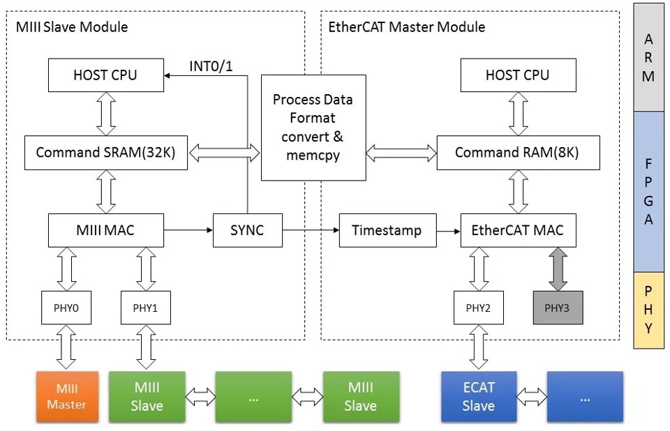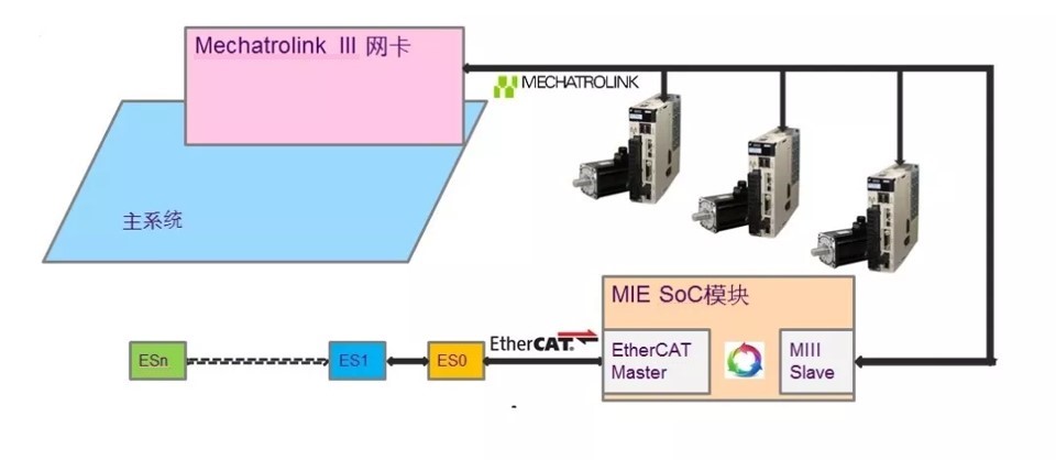 安川电机的Mechatrolink III是一项先进的工业以太网技术,在数控加工领域应用广泛。伺服设备多采用Mechatrolink III,但缺少配套的I/O或传感设备,国内的I/O或传感设备多采用 EtherCAT ,资源相对丰富。Mechatrolink III转 EtherCAT Master 的MIE SoC模块,有效解决了Mechatrolink III协议缺少配套设备的问题,能够快速接入,减轻系统负担,同时支持多个I/O设备接入。