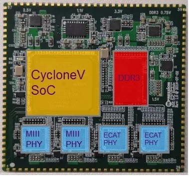 MIE SoC模块实物和结构框图如下图所示,基于Intel Cyclone V SoC模块, 最小片上系统,上电自启动。 FPGA 部分集成Mechatrolink III和EtherCAT两个IP,以及Mechatrolink III和EtherCAT之间报文转换和同步处理。不仅可以实现Mechatrolink III Slave转EtherCAT master,还可以实现Mechatrolink III master + EtherCAT master的双主站系统。FPGA 片上ARM A9处理器完成Mechatrolink III和EtherCAT初始化,周期性中断处理及异常处理等。