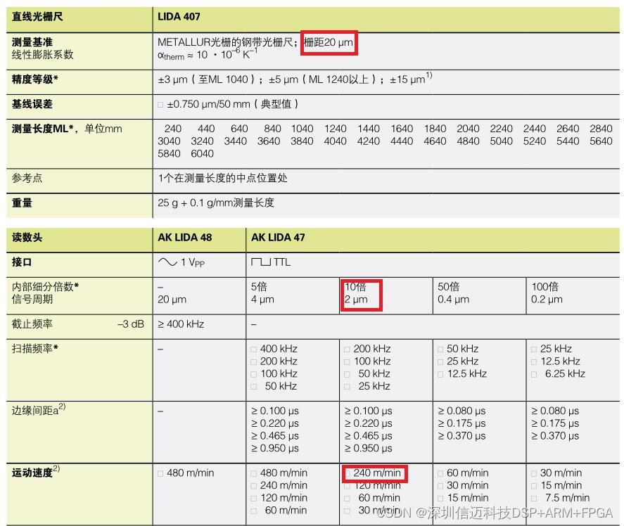 光栅尺是由标尺光栅和指示光栅两部分组成,指示光栅一般安装在读数头里。光栅的表面刻有均匀的条纹,条纹相互平行,条纹之间的距离(栅距)d 相等。光栅尺安装完成后,标尺光栅跟指示光栅是相互平行放置的,且两个光栅的条纹之间形成一个小角度_θ_,在光源的照射下,形成明暗相间的条纹,称为“莫尔条纹”。当标尺光栅跟指示光栅发生相对移过一个栅距时,莫尔条纹也进行移动过一个条纹距离。因为莫尔条纹的变化规律近似于三角函数,所以通过对莫尔条纹进行计数,从而测得标尺光栅跟指示光栅的相对位移,即可得到平台的移动距离。光栅尺的安装方式较为灵活,可安装在运动平台的不同位置。由图 5-1 可以看出,本课题的 X-Y 运动平台的两个运动轴的光栅尺的读数头相对其运动方向都是固定的,标尺光栅则是安装在活动部位上。本课题研究的 X-Y 平台采用的是 Heidenhain 公司的 LIDA477 系列的光栅尺,光栅尺的具体参数如图 5-3 所示。光栅尺的栅距是 20_μm_,采用了 10 倍的细分倍数,分辨率为 2_μm_,最大速度为 4_m/s_,通过驱动器的 4 倍频技术,平台的测量分辨率为 0.5_μm_。