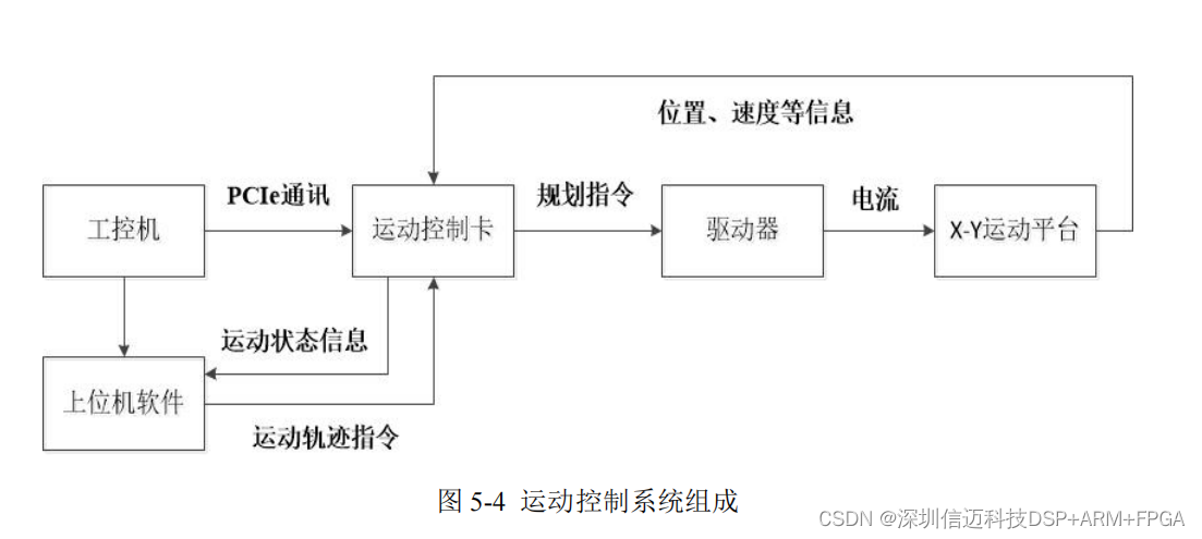 运动控制卡一般通过 PCI/PCIe 接口与工控机实现通讯,从而接收上位机软件发送的指令,并将运动规划指令送到驱动器中,驱动器进行运算、放大等处理,最终输出电流到直线电机,从而让运动平台进行动作,控制系统图如图 5-4 所示。