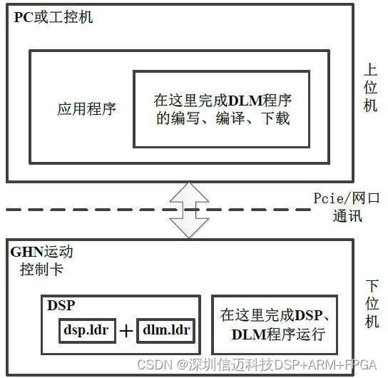 运动控制软件的功能结构如图 5-7 所示,dsp.ldr 是运动控制卡的固件,支持运动控制卡的各种指令,dlm.ldr 是基于本课题开发的伺服控制算法及运动规划算法。