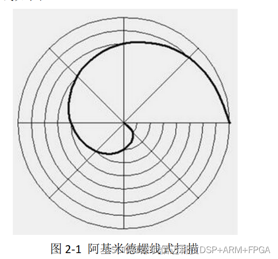 三自由度精密硅片检测运动平台检测的基本工作原理:光学镜头以 50um 大小(也可为 100um 或 150um 等)的光斑沿着阿基米德螺线,如图 2-1,完成对整个硅片上表面指定大小范围内的化学颗粒污染物的扫描检测。其中,阿基米德螺线式扫描运动可以由沿硅片半径 R 方向的匀速直线进给运动和沿硅片圆心 Theta 轴的匀速旋转运动叠加形成。合成后的阿基米德螺线如图 2‐1。