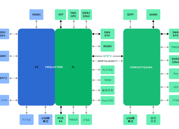 FMQL45T900具有一个FMC HPC接口,可外接各种FMC HPC子卡,接口具有6X的GTX信号和84对差分IO。
