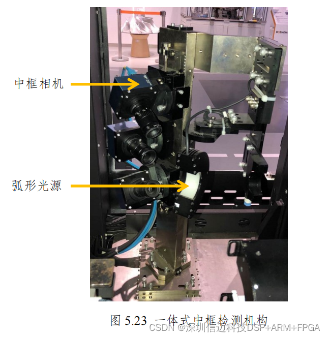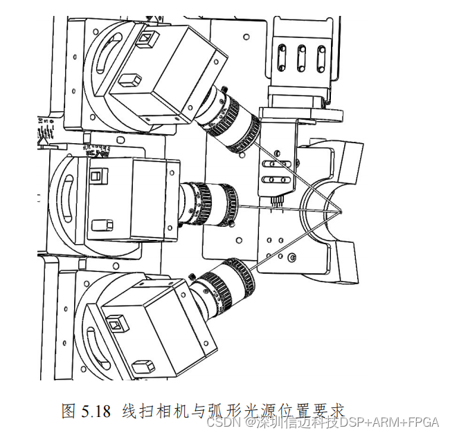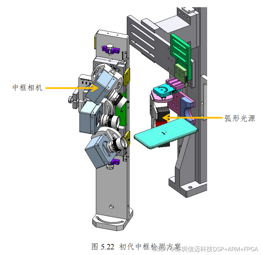 如图 5.22,中框检测机构主要是有三个线阵相机和一个弧形光源组成,三个
