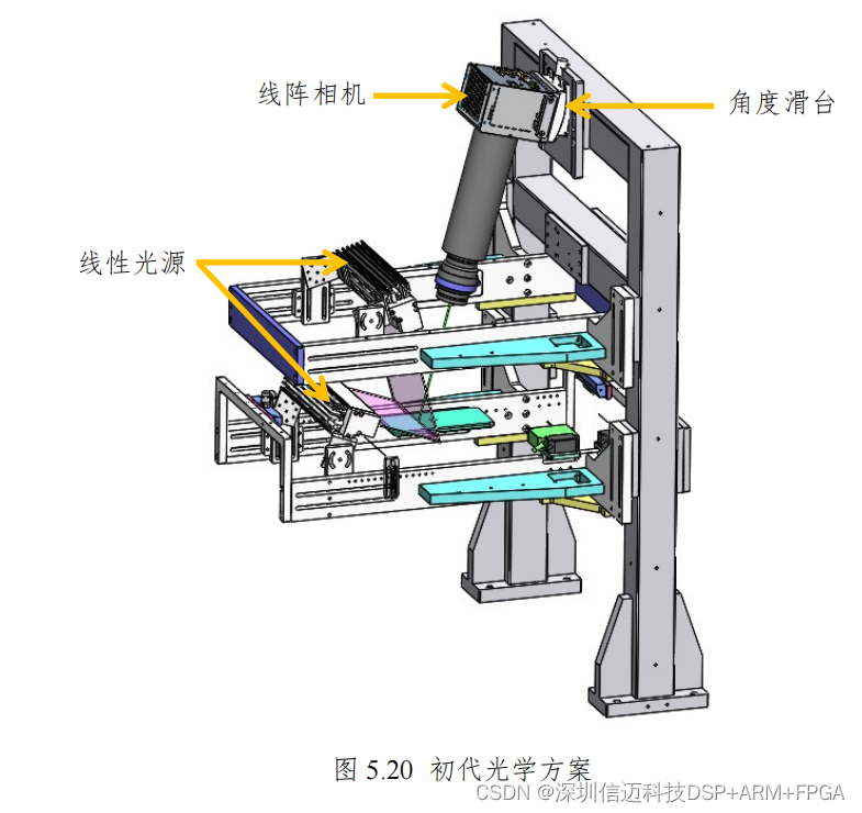 效率,如图 5.23,对机构进行了修改,将光源和三个线阵相机整合到一个机架上,