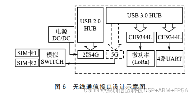 本可信网关支持多种无线通信模式,基于串口形式可适配微功率无线 LoRa、GPS/BDS、PLC,基于 USB接口可 对接4G/5G、NB IoT、WiFi等,另外根据功耗要求,需 要 单独一路 DC/DC为4G/5G供电,以保证整机稳定运行。 为了增强网关装置在 无线通信链路 4G/5G 中 的 应 用,功能上支持实现双卡单待、公转一体应用,硬件设计框