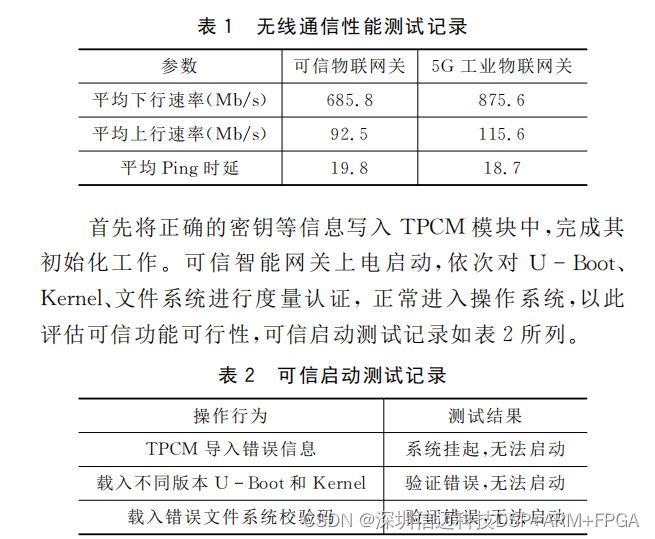 文中所提可信网关,正常启动加载至文件系统处需要 5s左右,而启用可行验证功能需要13s左右,这是因为采 用SPI接口形 式 而 非 高 速 PCIe接 口 形 式 与 TPCM 模 块 交互,抑制了认证效 率。表2为可信启动测试记录情况, 若分别对 TPCM 模块、U Boot、Kernel、文件系统非常操作,都会导致可信启 动 异 常,使用过程中必须严格管控