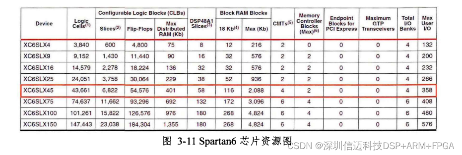 S p art an6 芯 片 采 用 4 5 nm 制 造 工 艺 , 内 部一共 有 4 3 6 6 1 的 L o g i c C e l l s 资 源 , 同 时 含 有丰 富 的 D S P4 8 A 1 S l i c e s 计 算 单 元 和 B l o c k RAM 存 储 单 元 , 另 外 支 持 C MT ( C l o c k