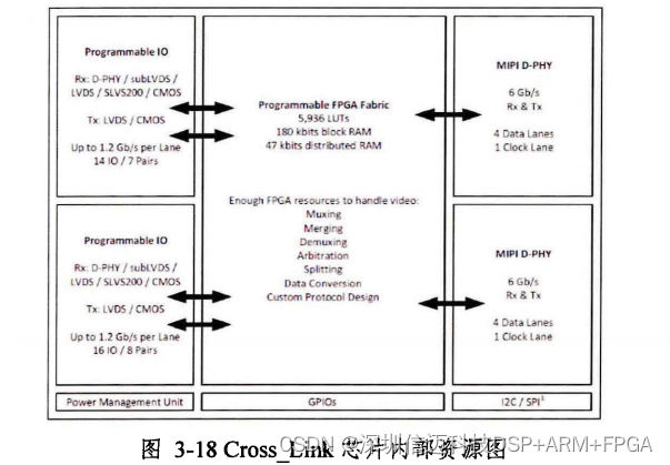 如 图 3-1 8 所 示 , C r o s s_L i nk 内 部 拥 有 2 个 MI PI D - P HY 的 硬 核 , 并 且 拥 有 众 多Pr o gr amma b l e 1 0 资 源 , 支 持 多 种 协 议 或 者 接 口 , 外 围 还 包 含 有 P o we r Man ag e me nt Uni t 、GP I O s 以 及 I 2 C / S P I 通 信 单 元 , 很 适 合 数 据 类 型 转 换 。 具 体 型 号 为 : L I F -MD 6 0 0 0 -6 KMG 8 0 I 。