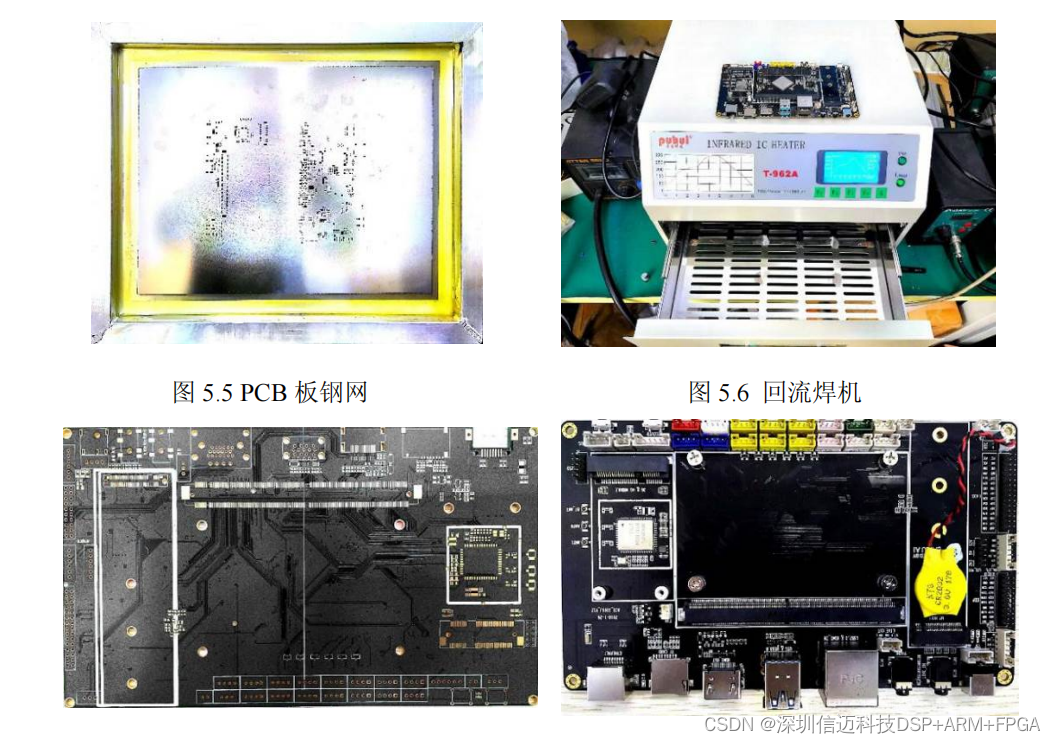 首先对电源模块进行焊接和调试,因为电源是整个开发板能否正常使用的最关键因素。主要策略就是边焊接边测试。在焊接电源降压芯片后测试降压后的 5V 和 3.3V 电压满足系统要求。然后分别开始焊接无线模块,电机驱动模块、传感器模块等。因板子元器件过多选用的元器件封装又很小(如电阻 0402 大小的封装)手动焊比较麻烦。在测得功能可用后证明 PCB 设计没重大缺陷,然后应用回流焊机对整版元器件进行焊接。回流焊机焊接后的板子比较漂亮美观。在摆放元器件时需要应用钢网在 PCB 裸板上涂锡膏然后摆放元器件后放入回流焊机中。如图 5.5 和图 5.6 所示分别为 PCB 钢网和回流焊机制,如图 5.7 和图 5.8 分别为 RK3399 外围板裸板图和应用回流焊机焊接元器件后的 RK3399 正面图。从图 5.8 可以看出 RK3399 外围板外接扩展口很多,但很多本设计