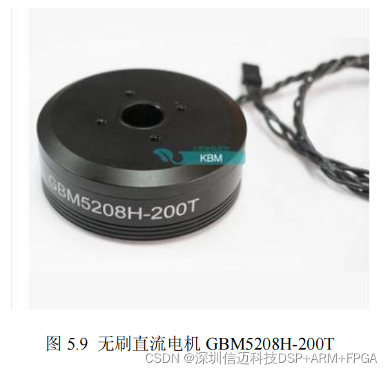 根据系统承载重量和稳定性要求云台选用可承载 800g-1000g 重量有大扭矩的电机。 本设计选用的俯仰框架电机,横滚框架电机和方位框架电机选用的是同型号的无刷直流 电机其型号为 GBM5208H-200T,如下图 5.9 所示。该电机 KV 值较小,绕组匝数相对较多,最高输出电流小,扭矩较大,运行转速较低比较适合稳定云台实际运行情况。