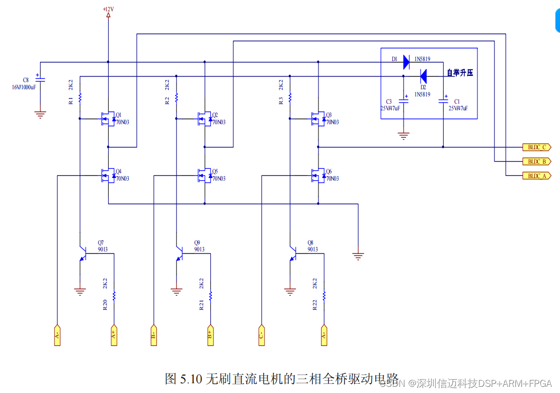 2)从图 5.7 可以看到上臂场效应管经过Q7、 Q8、 Q9 驱动逻辑电平后和下臂场效 应管刚好相反。这样的好处在于当 MCU 上电时 I/O 状态默认为 1,上臂场效应管不会 导通,只有下臂场效应管会导通。因此消除了安全隐患。