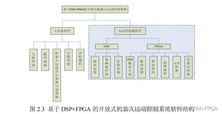 人运动控制系统软件结构如图 2.3 所示,其中右侧阴影部分即为基于 DSP+FPGA 的开放