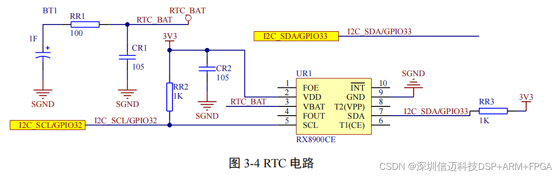 图 3-4 中 RTC 电路所示)。7 引脚 WP 的作用是写保护,当该引脚为高电平状态时,将
