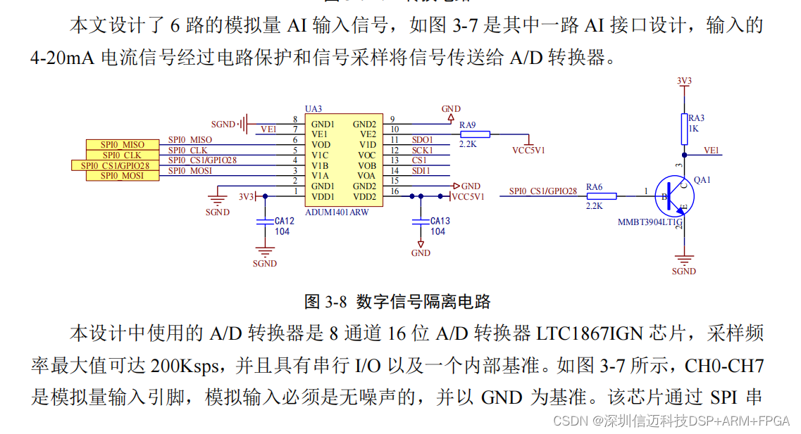 隔离,隔离器选用的型号是 ADUM1401ARW,旨在提高模拟量信号输入系统的稳定性。