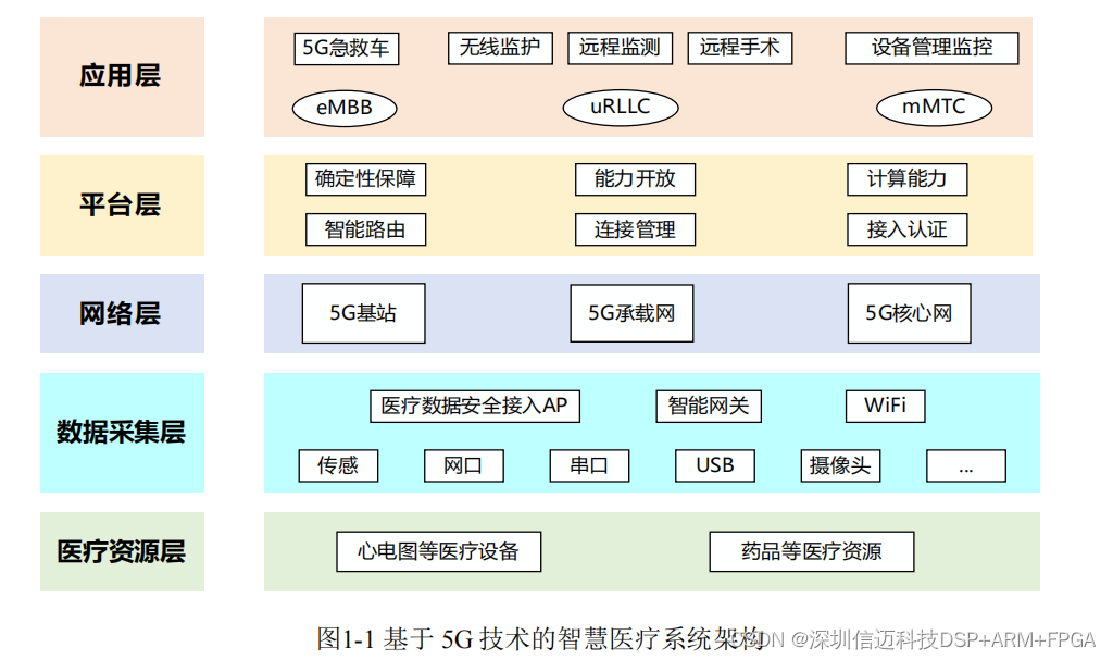 医疗资源层为医疗系统提供物质性保障,主要包括用于诊断救治的医药资源 以及医疗设备,奠定医疗体系的基础与医疗物联网数据的来源。数据采集层对应 于物联网体系中感知层面的技术,目的是实现各种医疗设备的数据采集。通过各 种医疗设备配置的异构通信接口、生理传感器、对医疗信息进行实时采集,然后 将采集到的数据提供给医院管理系统特定的接口,使数据得到进一步处理和管理。 该层面的技术就包括但不限于网关 AP、物联网终端等相关技术。网络层利用 5G 基站、承载网、核心网作为医疗系统数字化信息的传输媒介。平台层主要实现智 能、准确、高效的医疗信息处理,利用先进的边缘计算、人工智能、云计算与大 数据等新技术运用,为前端的应用输出有价值的信息。应用层上主要针对行业的实际需求,实现成熟多样的医疗信息化应用。