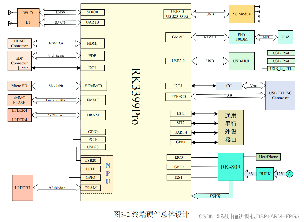 根据对 5G 移动医疗终端系统应用需求分析后,设计基于 RK3399Pro 处理器 的终端系统总体结构如图 3-2 所示。终端以瑞芯微 RK3399Pro 处理器作为主处理 单元,通过配置内存、存储、电源以及多种外设接口,使终端具备一个全功能的 医用物联网网关的硬件配置。