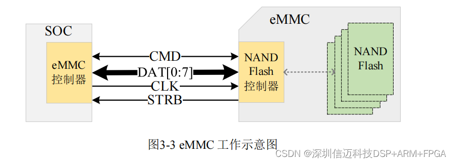 对于终端存储功能的需求,设计中提供两种存储方式,其一现代的移动终端 设备(手机、平板)中常使用嵌入式媒体卡[39](Embedded Multi Media Card, eMMC)。并且 eMMC 在嵌入式系统中,作为存储设备,起到硬盘一样的作用, 用于存储系统镜像、引导操作系统启动。另一种方式为 SD 卡外置存储,对于需 要存储的大容量数据,可配备外置的高速存储卡。 eMMC 中包含 NAND Flash 控制器和 NAND Flash 存储介质。NAND Flash 由内部控制器管理,它管理 ECC、磨损平整和坏块管理。eMMC 控制器对复杂的NAND Flash 管理提供的标准的集成封装,SOC 通过 NAND Flash 控制器访问NAND Flash,完成数据读写操作。经过封装后的接口模块,可通过简单的连接关 系至 SOC。eMMC 与 SOC 之间的工作关系如图 3-3 所示。