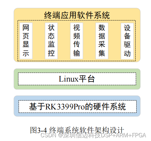 5G 医用终端软件系统架构如图 3-4 所示,包含 Linux 系统以及应用程序。软 件系统需以 RK3399Pro 处理器为硬件基础,在 Linux 系统下,移植 BootLoader、 内核、设备驱动等完成对硬件层的适配,以提供终端应用程序的运行环境。因此, 对终端软件系统的开发设计包含硬件驱动、操作系统、应用软件等多方面。