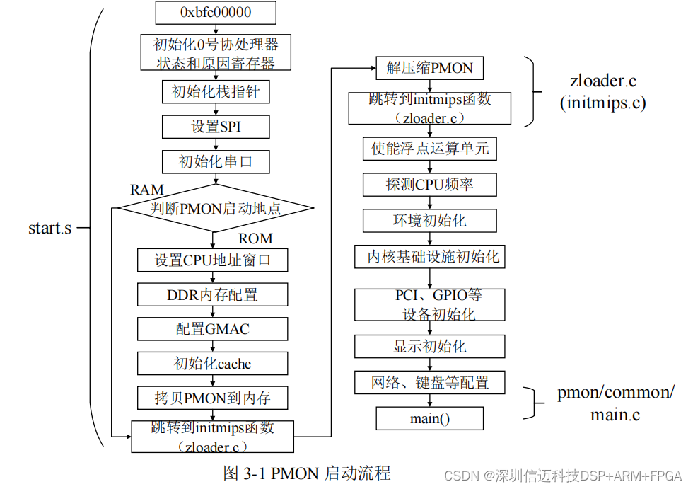 PMON 启动流程如图 3-1 所示,准备工作完成后,start.s 将第二部分压缩的 C