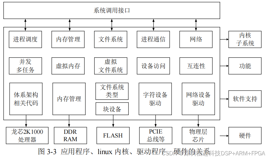 本课题中应用程序、Linux 内核、驱动程序、硬件关系如图 3-3 所示,Linux 内